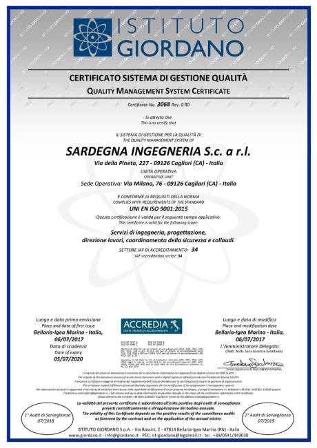 Sardegna Ingegneria S.c.a r.l. è in possesso della Certificazione di conformità del proprio Sistema di Gestione Qualità alla normativa UNI EN ISO 9001:2015. I campi applicativi della certificazione sono: “Servizi di ingegneria, progettazione, direzione lavori, coordinamento della sicurezza e collaudi (Settore IAF di accreditamento: 34)”.